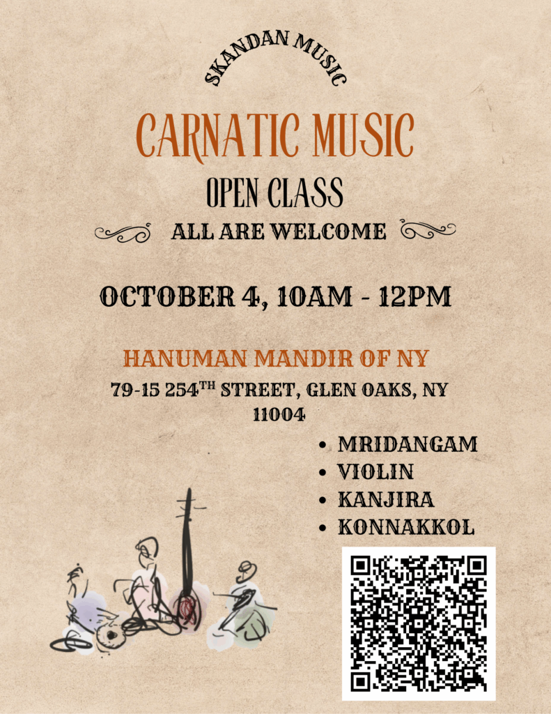 Announcing a new Carnatic music class in Glen Oaks, Queens NY this spring! Classes will be held at the Hanuman Mandir at 79-15 254th Street, Queens, NY on Saturdays from 10am to 12pm.
